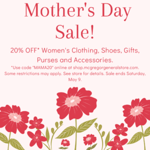 Monday, May 4 thru Saturday, May 9! You are sure to find something mom will love. Save 20% off women’s clothing, shoes, gifts, purses and accessories. Some restrictions may apply. See store for details. Use code “mama20” online at shop.mcgregorgeneralstore.com. PLEASE NOTE: If you choose “Store Pickup” as your shipping option, it will be held at McGregor General Store, our sister store in McGregor.